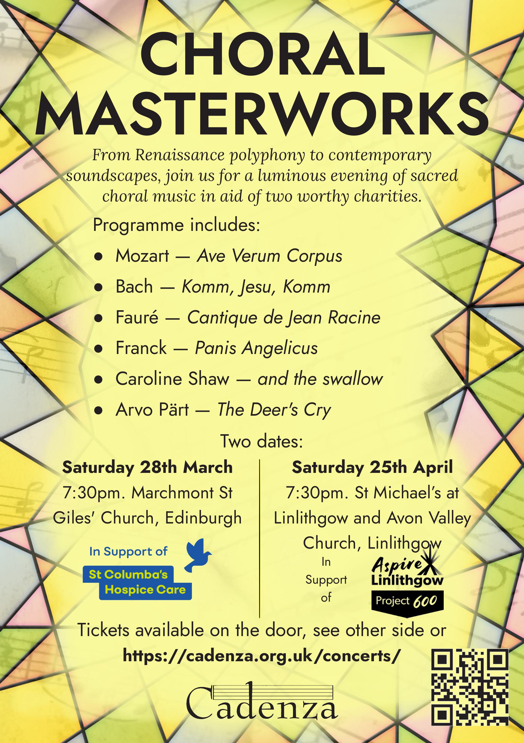 From Renaissance polyphony to contemporary soundscapes, join us for a luminous evening of sacred choral music in aid of two worthy charities. Join us for an uplifting evening of sacred music in Cadenza’s annual Easter charity concert series — this year in aid of St Columba’s Hospice and St Michael’s Church, Linlithgow. Spanning five centuries, … Read more